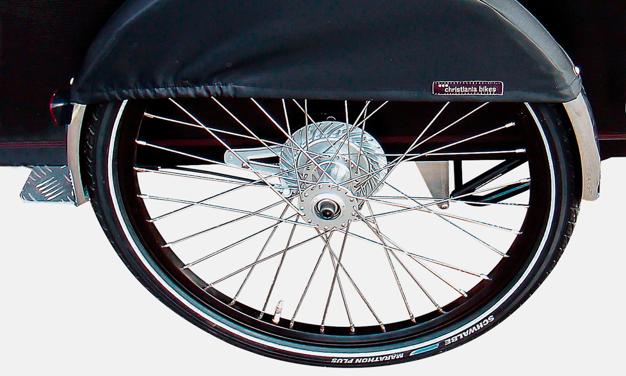Afskærmning til vores 24″ og 26″ forhjul som forhindrer, at børnene kommer i kontakt med forhjulene. Afskærmningen er lavet af samme stærke materiale som vores kalecher og monteres på de rustfrie skærme.